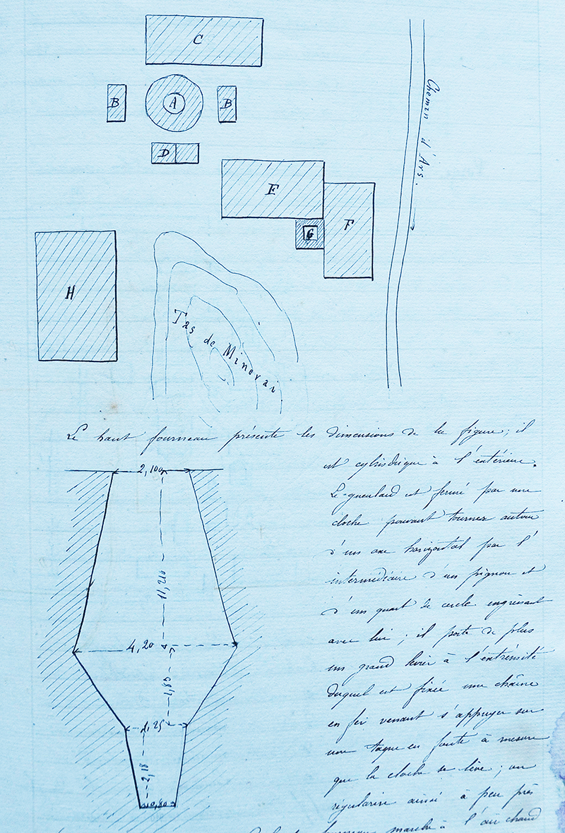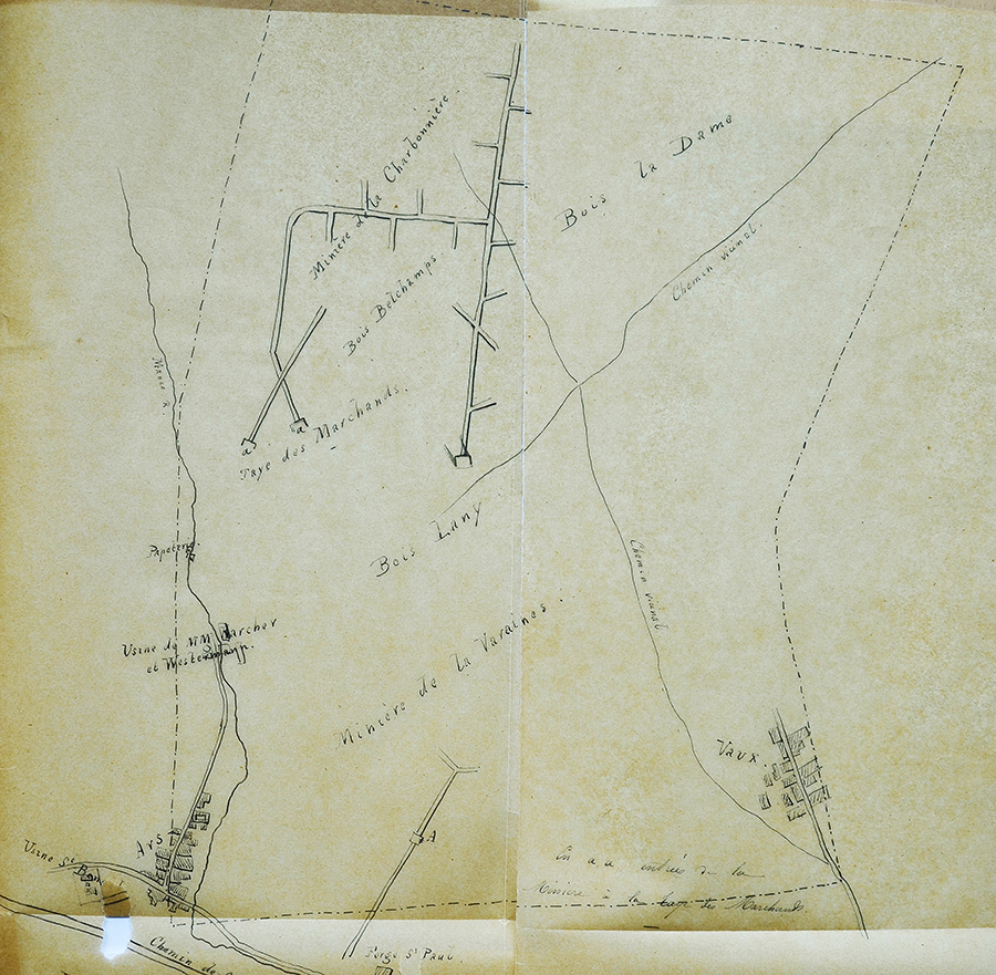 « Cette mine se trouvant à une assez grande distance de l’usine, je ne l’ai pas visitée, des indications complètes m’ayant été données à l’usine même. Mode d’exploitation indiqué sans cependant un plan d’ensemble bien arrêté. Ce qui pourrait plus tard amener de grandes difficultés. En outre, la galerie de roulage sort de l’autre côté de la vallée ce qui nécessite un transport très couteux (Note : Il s’agit de la mine de la Charbonnière). Ces deux raisons ont déterminé à faire un petit sondage à la corde pour pouvoir ultérieurement pousser une galerie dans le gîte même (Note : depuis la mine de Varraines) en allant rejoindre les anciens travaux. Un petit plan automoteur servira à amener le minerai de A jusqu’au niveau du sol de l’usine. On ne peut pas l’amener au gueulard parce qu’il faut un cassage préalable et que par ailleurs le plan automoteur n’aurait plus une pente assez forte. On espère par ces dispositions réduire les frais de transport de 1 franc la tonne à 0,25 franc. » « Je joins le plan de la concession qui aura l’avantage de montrer les relations de position des usines de MM. Dupont et Dreyfus et celle de M. Karcher et Westermann. »