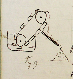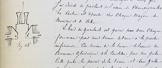 Les hauts fourneaux sont au nombre de 4 dont un seul est actuellement en marche. Deux autres sont en construction et on est en train de démolir le quatrième pour le reconstruire à neuf (hauteur entre 20 et 25 m.) » « Le laitier qui s’écoule des hauts-fourneaux tombe au fur et à mesure dans des réservoirs remplis d’eau fraîche. Là, il se réduit en une sorte de sable que l’on retire à l’aide d’une chaîne sans fin portant une série de tasses qui prennent le laitier au fond de la cuve et le rejette sur un plan incliné qui l’amène au-dehors. On se sert de cette espèce de sable pour faire un mortier en le mélangeant avec du sable. On a trouvé un grand emploi dans la construction des forts à l’extérieur de Metz. Ce produit vaut 1 F le m 3. On en produit chaque jour 5 à 6 wagons. »