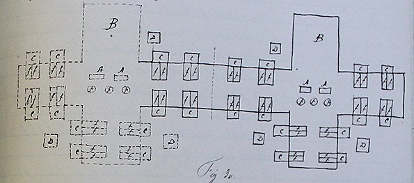 « Teneur du minerai 39% : un minerai siliceux rouge, un minerai calcaire jaune et un minerai argileux brun. » « On est en train d’élever de nouveaux bâtiments qui formeront avec la partie déjà existante un tout harmonieux. Le plan suivant montre en trait plein la partie déjà existante et en trait pointillé la partie en construction : »