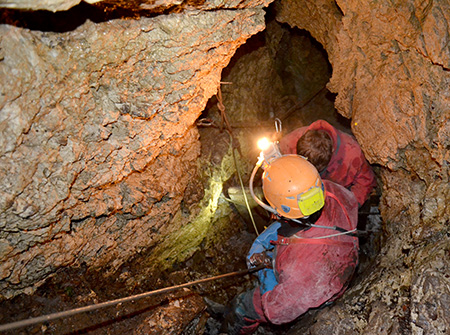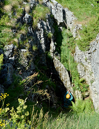 Orlujak : gouffre désobstrué à l'aplomb du porche d'Orlujak 1. Il permet de prendre pied dans le réseau sans passer par les vires extérieures.