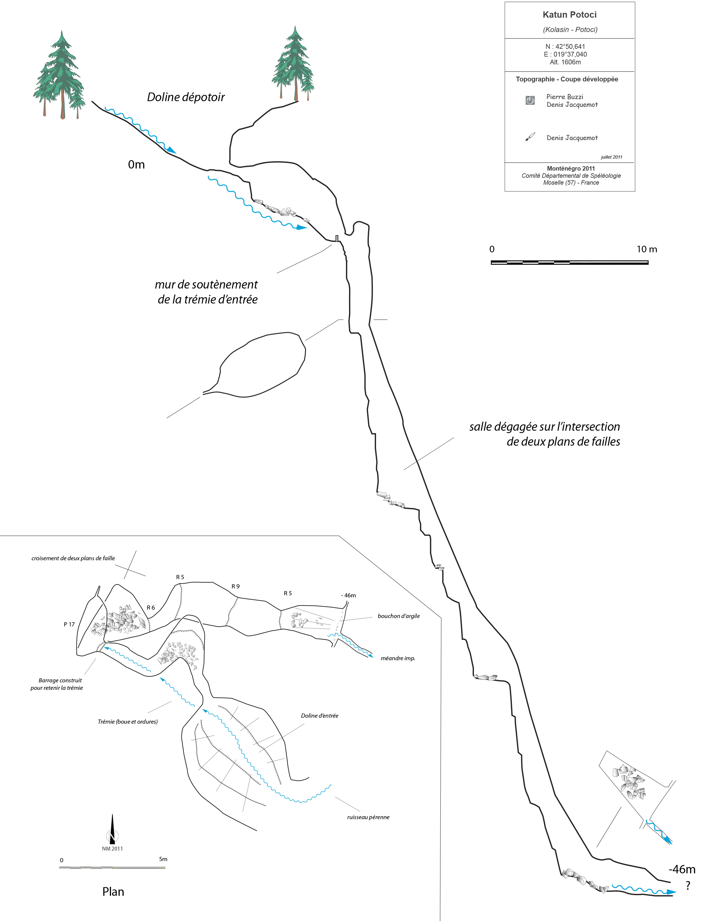 profit de deux plans de faille. Il descend par une succession de ressauts arrosés. A -46m, le ruisseau se perd dans un méandre impénétrable. Possibilité de désobstruction.