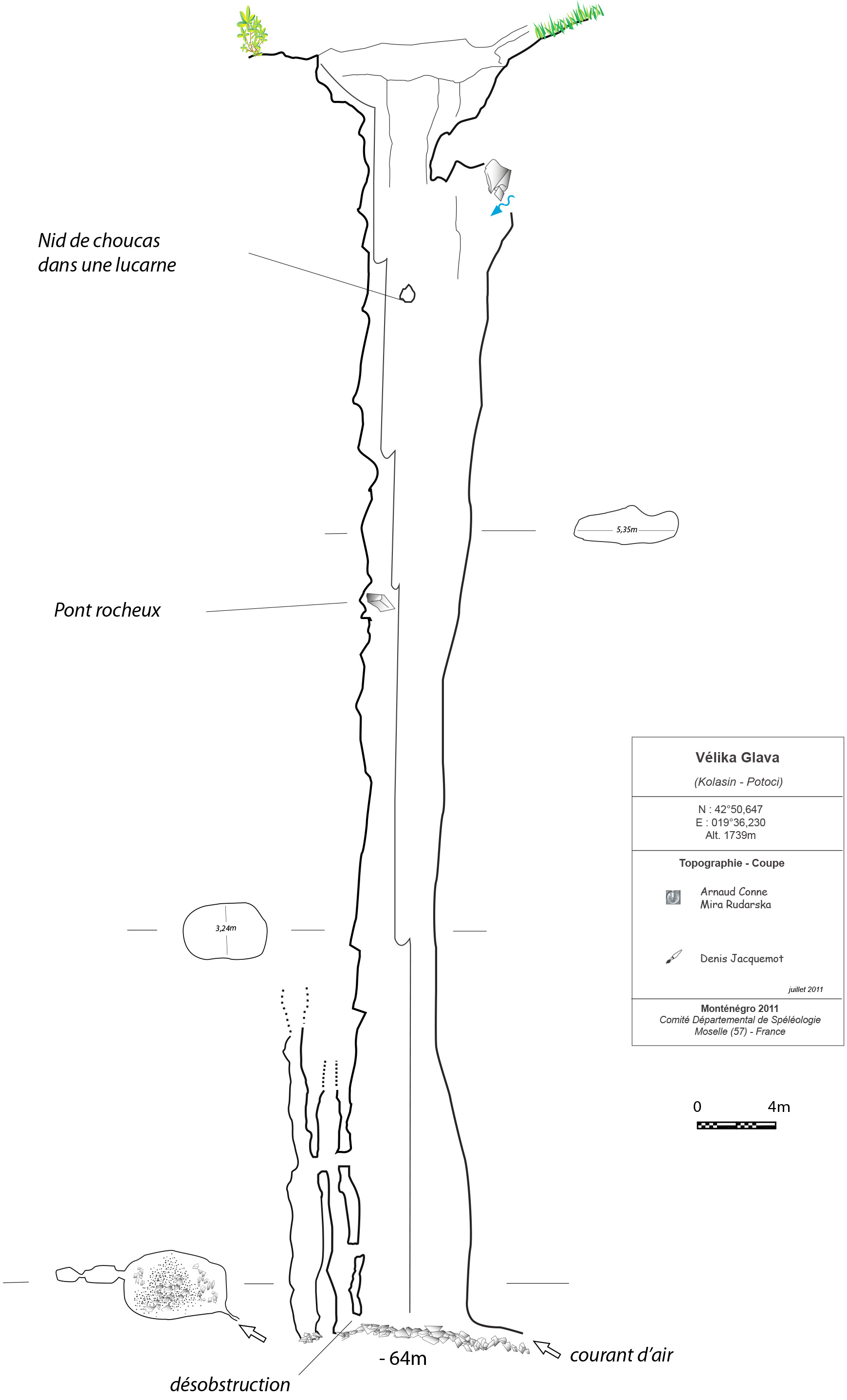 Velika Glava : gouffre de 64m. Au fond, des lucarnes désobstruées donnent accès à des drains parallèles au puits principal. Des escalades n’ont rien donné. présence d'un courant d'air à -64m.