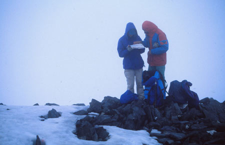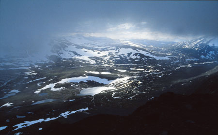 L’après midi va s’écouler tranquille : petites sucreries, bonbons, bouquin… le temps a l’air de se remettre au beau. Le temps hésite, un peu de noir encore vers le Sud mais une superbe lumière… alors, à 17h45, on se met en route vers le sommet du Gavelberget (1819m). Deux heures et quart plus tard, on est au sommet (900m de dénivelé) en plein dans le brouillard qui va jouer avec nous en se déchirant parfois pour nous faire éclater sous les yeux un feu d’artifice de pics, de neige, de glaciers, de couleurs, de lumières, d’arc en ciel, d’horizons échevelés, de lacs et de torrents étincelants !