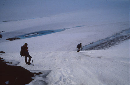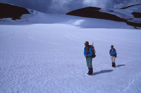 Longue remontée sur le glacier avec un bougre de replat où on a pris l’eau jusqu’à mi-mollet dans une neige fondante et merdique.