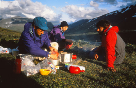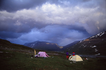 Camp établi entre deux lacs. Un troupeau de rennes est passé dans la matinée sur le flanc de la vallée accompagné de quelques éclaireurs qui venaient brouter au pied des tentes.