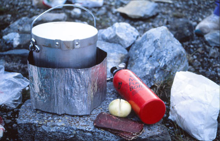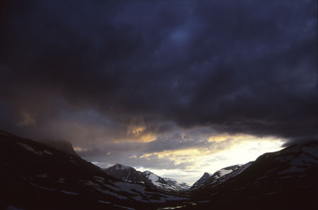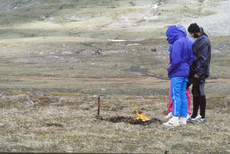 Le camp est établi au milieu des saules nains. Petit feu qui sentait bon, lavage des cheveux dans le torrent et, pour finir, spectacle étonnant du rabattage d’un troupeau de plus de 1000 rennes à l’aide… d’un hélicoptère toutes sirènes hurlantes ! Spectacle lumière dans toutes les directions : tous les gris du monde vers la Pasttavagge, de l’or qui coule en gros rouleaux vers le Sud, au-dessus de l’Alkatj et naissance de la lumière vers le NW, tout au fond de la Ruopervagge. Le tout couronné d’arcs en ciel… où qu’on est ??