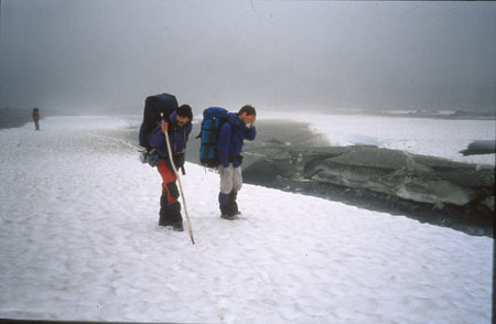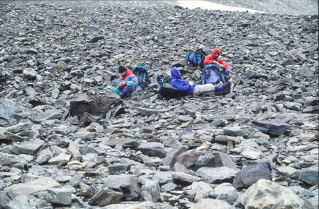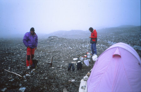 Installation du camp 7 au col à 1066m au milieu d’un désert lunaire sur une vaste plage morainique au fond d’un défilé surmonté de deux sentinelles plus sombres l’une que l’autre. Mais le vent est tombé et il fait relativement bon. Honoré a fini sa dernière cigarette ! Depuis 1 heure ou 2, le brouillard n’arrête pas de passer. La nuit sera sans doute très bonne dans ce désert de cailloux, sans le bruit perpétuel des torrents...