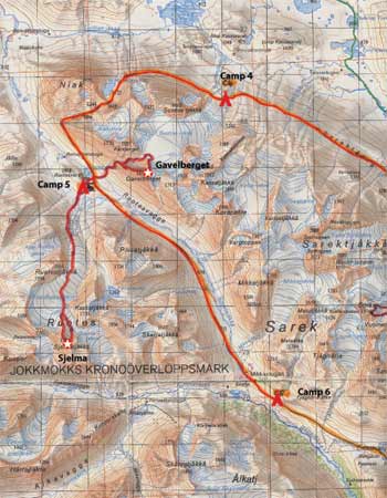 Marche sans problème jusqu’à un pont ( c'est le deuxième pont qu'on traverse... ça nous change des gués habituels) qui domine une chute spectaculaire et fracassante. C’est la première trace humaine depuis plusieurs jours. Etablissement du camp 6 sur un balcon dominant le cour amont de la Rapadalen : cour majestueux et impressionnant, la rivière sort d’une vallée d’où semble naître la lumière.