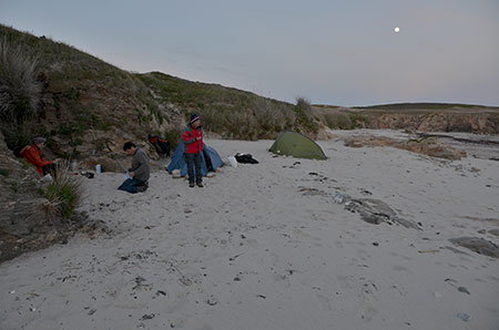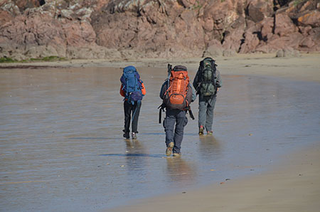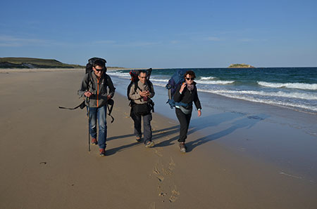 Direction la côte sud pour y trouver un emplacement de bivouac à l'abri du vent. Drôle d'impression que de marcher en mode rando sur des plages désertes.