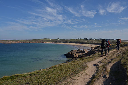 Très belle balade avec des paysages somptueux. La côte de granit, la mer bleue, le soleil et étrangement peu de monde ! Un petit coin de paradis. On arrive au port avec deux heures d'avance et pas moyen de boire un coup, tout est fermé ! C'est vrai que ce n'est pas encore la pleine saison... On sortira donc le réchaud sur le quai pour un petit café. Y en a même un qui profite des toilettes pour se raser !! On attrape le bateau de 16h45 avec une classe de gamins venus sans doute passer une journée sur l'île.