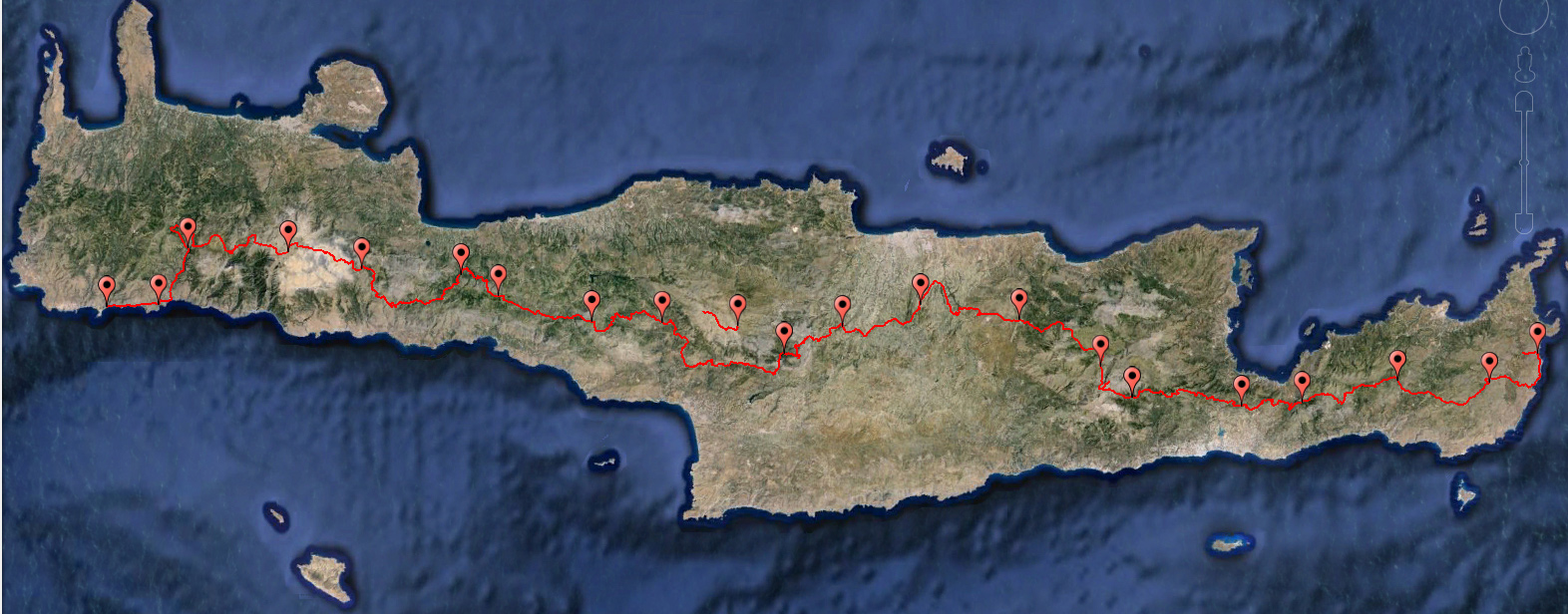 Le sentier européen E4 est un sentier européen de grande randonnée d'une longueur totale de 10 450 km qui se déroule d'ouest en est. Il débute en Espagne, puis passe par la France, la Suisse, l'Allemagne, l'Autriche, la Hongrie, la Roumanie, la Bulgarie, la Grèce (en passant par la Crète) pour finir à Chypre. Il y a quelques années déjà, j'avais repéré ce sentier sur les cartes de Crète. Ce projet me trottait dans la tête. Il ne restait plus qu'à le finaliser... Magnifique aventure à travers la terre crétoise ! Chemin d'exception qui ne se laisse pas facilement apprivoiser. Il faudra souvent le chercher, ne pas le trouver et naviguer à l'instinct. Mais c'est ça aussi la découverte de ce pays attachant et hospitalier. Aucun regret et l'envie d'y retourner ! Nous avons parcouru environs 450 km en 21 jours de marche. 18 560m de dénivelé positif et, bien sûr, autant en descente puisqu'on est parti de la mer Egée pour finir au bord de la mer de Lybie. A la fin de notre parcours, il était prévu de retrouver Christiane, Elsa et Stéphanie qui avaient un pied à terre entre Heraklion et Rethimno. Il était donc plus simple de finir à l'ouest de l'île. C'est pour cette raison que nous avons parcouru le E4 de l'est vers l'ouest, de Hohlakies à Paleochora. La carte ci-dessous indique nos 21 étapes avec 18 nuits sous tente et 3 à l'hôtel (Kastelli, Arhanes et Argiroupoli).