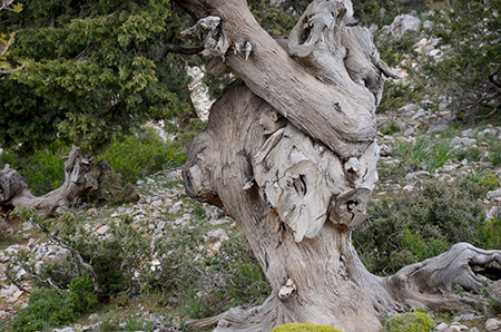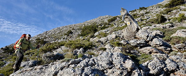 Une tasse de café et on se lance. Départ du camp vers 6h45, ça monte plutôt bien, ce matin. De loin en loin, des balises nous appellent. On serpente dans un lapiaz où les dernières traces de végétation disparaissent bientôt. On laisse derrière nous les derniers troncs blanchis sous le soleil. On suit une belle arête esthétique et aérienne d’où l’on découvre, au loin, Chania et la côte nord de l’île. Pas de sentier au sol mais le cheminement est évident, au moins jusqu’au premier col de la journée.