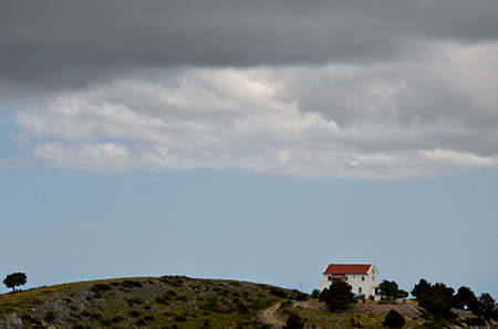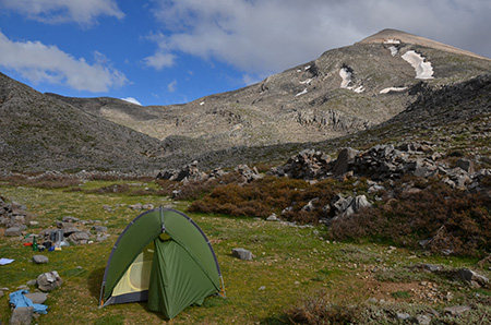 Le chemin, bien marqué maintenant, remonte la vallée et se hisse de ressauts en ressauts jusqu’au refuge de Katsiveli, fermé bien sûr. Ils sont rares les refuges de club de montagne et tous fermés ! Il n’y a donc que les chapelles d’ouvertes pour offrir, au randonneur, un abri en cas de besoin… On descend monter la tente aux bergeries en contrebas, au pied du Pachenes (2453m), le point culminant des Levka Ori. Mais il ne sera pas pour nous ! On n’a pas assez d’eau pour se permettre cette variante.