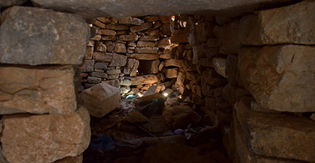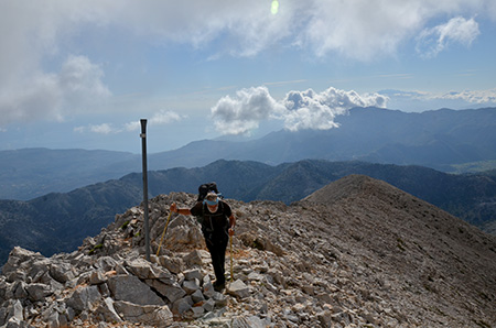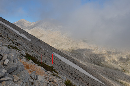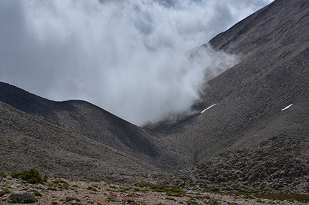 De col en col, on progresse rapidement. Un moment pris dans le brouillard, on trouve quand même le passage clé, une brèche étroite. A partir de maintenant, le balisage sous forme de marques de peinture jaune et noire devient plus fréquent. La peinture est récente. Il est vrai qu’on approche du refuge de Katsiveli qui est peut-être le point de départ d’une rando qui vient finir ici…
