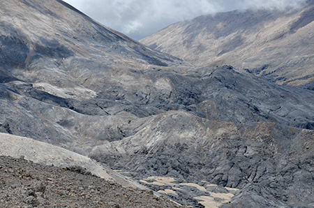 Un grand travers sur des éboulis nous amène à un nouveau col qui nous ouvre les portes d’une vallée lunaire. J’ai rarement vu un spectacle pareil. Le socle calcaire mis à nu moutonne et se crevasse comme un glacier. Cette vallée est un endroit unique réservé à quelques rares privilégiés. En effet, pas de sentier marqué et quelques balises dont il ne reste souvent que le poteau qui git à terre, terrassé par des éléments auxquels on préfère ne pas penser.
