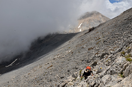 Pour l’instant, le ciel est toujours bleu devant nous et le brouillard va et vient dans notre dos. Une longue traversée horizontale sous le Pic sans nom (2070m), un nouveau col… Le spectacle est toujours aussi infernal (qui appartient à l’enfer) mais nous, on est plutôt au paradis et je me régale dans cette progression où la recherche du chemin ajoute à notre plaisir.