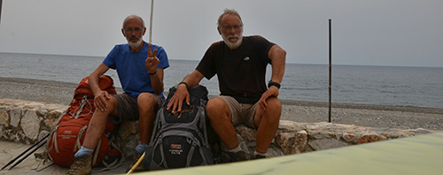 Encore une longue descente en lacets interminables pour arriver au plateau d’Omalos. (on a du louper le sentier quelque part…). Omalos où on pensait bien s’acheter une bonne bouteille pour fêter la fin des Levka Ori. Mais, il n’y a rien. On reprend le macadam. Un couple de belges s’arrête et nous prend en voiture jusqu’à l’entrée des gorges d’Irini. Cinq minutes de voiture pendant lesquelles on aura même eu droit à la recette des frites…