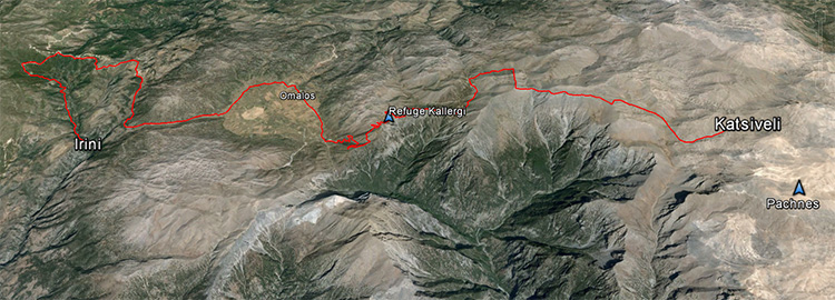 Dernière longue descente pour tomber sur une piste (ça faisait longtemps !) qui monte jusqu’au refuge de Kallergi, refuge gardé dans la plus pure tradition des refuges du CAF : tu te déchausses pour entrer, tu avales un bol de soupe aux lentilles accompagné d’un mauvais vin. Mais tu es au paradis au-dessus duquel plane un couple d’aigles.