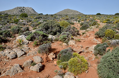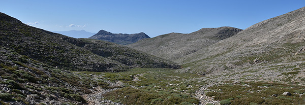 La montée à l’ombre du petit matin est facile et le chemin bien balisé (points rouges et quelques rares balises E4). Un premier col est atteint puis descente dans une combe pour attaquer une longue remontée d’un vallon encaissé où subsistent quelques névés. Ce vallon est le chemin d’accès au col qui donne accès au versant nord du Psiloritis. La plaine s’étend à nos pieds et l’horizon s’ouvre vers la mer.