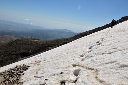Le sentier prend alors un cap plein ouest et monte dans le travers du versant. Quelques névés sont franchis sans problème et on atteint la crête juste en dessous du sommet.