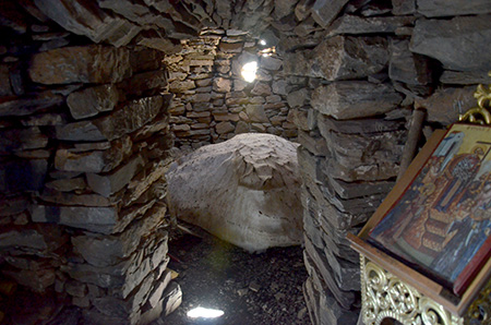 Chapelle, refuge, antre de quelques divinités oubliées, tanière mythologique… c’est un endroit envoutant. On y pénètre, le dos vouté, par un petit corridor. Les yeux doivent s’habituer à l’obscurité traversée uniquement par quelques raies de lumière qui filtrent au travers des pierres mal jointes. Un névé occupe une grande partie des lieux. Quelques icônes, des cierges et des fragments d’encens mal consumés, des dons de randonneurs… on se croirait au cœur d’un culte clandestin.