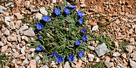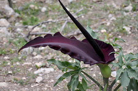 Avec Denis, comme l’an passé lors de la randonnée sur le GEA (Apennins), nous avons choisi une plante emblème de la rando (critère de beauté, de présence le long du chemin …). C’est Dracunculus vulgaris (serpentaire, arum dragon) qui s’est imposé par son étrangeté, sa taille (pouvant atteindre 120 cm de haut), ses couleurs, sa présence quasi continue (sauf en altitude ou dans les milieux trop secs) ; cependant quand nous sommes arrivés dans les montagnes blanches (Lefka Ori) nous avons craqué aussi pour Anchusa cespitosa (Buglosse cespiteux) une magnifique borraginacée couvrant les rochers calcaires entre 1200 et 2200 mètres, plante endémique considérée comme rare. Ce sont donc ces 2 espèces qui symboliseront notre randonnée. On aurait pu aussi élire Ebenus cretica ou le Crocus de Sieber ou le Cyclamen de Crète toutes espèces très belles.