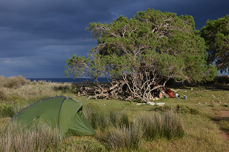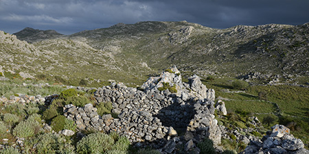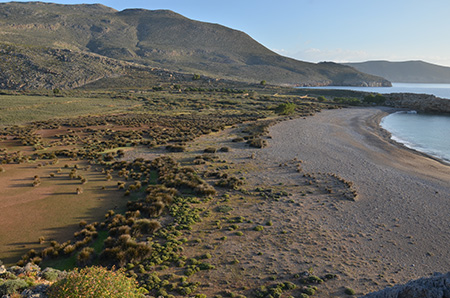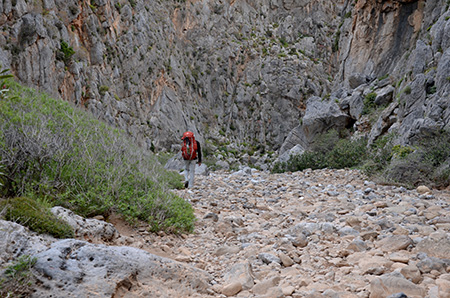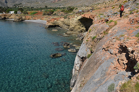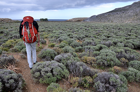 Lever vers 6h alors que quelques chèvres descendent vers la mer toute calme et bleue. A l’angle sud de la plage, le chemin repéré la veille nous attend. Des balises E4, quelques marques rouges et des cairns jalonnent la piste ou plutôt nous donnent la direction à suivre. Il n’y a pas vraiment de chemin et il est très facile de perdre les marques. Il faut donc marcher au cap et improviser. Premier contact avec le lapiaz et sa couverture d'épineux de toutes sortes.