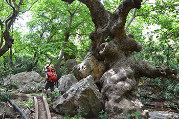 Remontée des Nekron Gorges ou gorges de la mort, nommées ainsi à cause des nombreuses sépultures minoennes qui y ont été trouvées. On croise beaucoup de monde qui les descendent. On a l’impression de se trouver au fond d’un oued marocain. La végétation est spectaculaire : des arums dragons qui nous suivront tout le long du chemin et des platanes d'orient centenaires aux troncs qui racontent toute leur souffrance.