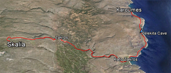 Zakros, pause bière et achat de pain. Le patron du kafenion nous demande où l’on va. Soughia qu’on lui répond…Il nous donne alors l’adresse d’un restaurant ! En sortant du village, on croise un français installé ici. Il y fait le commerce d’huile d’olives et il a l’air de bien apprécier le rythme de vie des crétois.