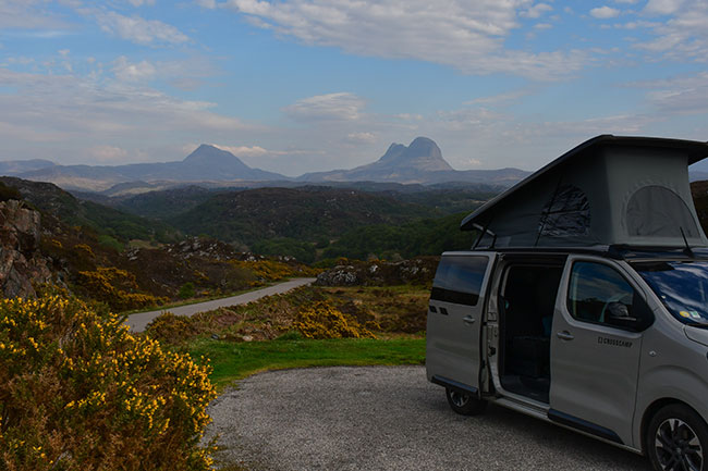8 mai 2024. Camp en bord de route avant Achriesgill. Cave of Smoo (Durness) et rando dans la lande : Bhlar Duibhe (7km). Paysages superbes le long de la route qui mène à Durness.