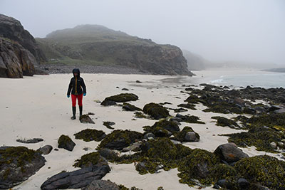 9 mai 2024. Même camp que la veille (un peu coincé par la météo). Balade dans le brouillard sur la plage de Oldshoremor et fish and chips au port de Kinlochbervie.