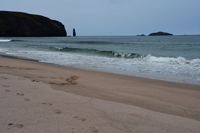 10 mai 2024. Camp posé entre Clachtoll et Lochinver. Rando à Sandwood Bay (14km). Superbe plage. Petite géocache.