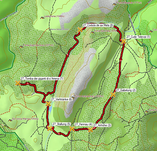 2 mai. Même endroit que la veille. Rando Rother n°27. Parcours pastoral au début puis la Tombe des Géants de Ste Arena et retour par un beau sentier de charbonniers.