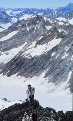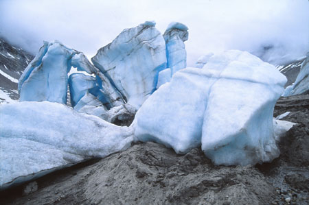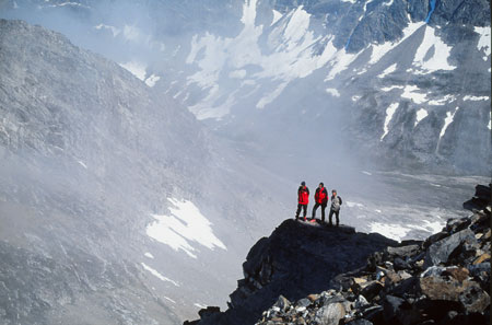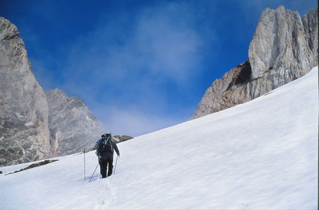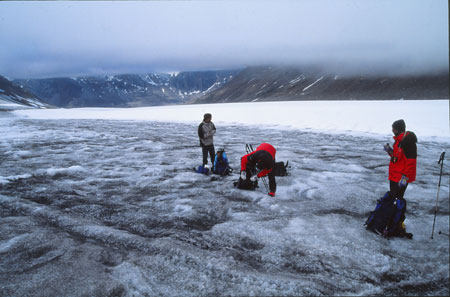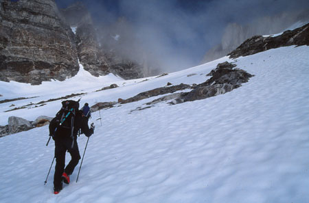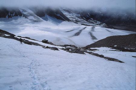 Départ du camp vers 9h30 et montée, sous le brouillard, vers le glacier de la Brèche, ainsi baptisé spontanément par l’équipe. Un petit peu à l’aveuglette, on se dirige vers la branche droite du glacier pour finir dans le fond d’un cirque tout encapuchonné de brouillard qui se déchire de temps en temps, nous laissant entrevoir des tours blondes se détachant sur un ciel azur !