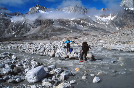 Dimanche 14 juillet Tea time… au camp 2 installé sur une moraine, terrasse pour les tentes, gros blocs pour la cuisine et cailloux/sièges pour le cul. Deux jours, samedi et dimanche ont été nécessaires pour un double portage à partir du camp 1 où je réussirai à oublier mes gants ! Du camp 1 vers le camp 2... en double portage, c'est presque confort !