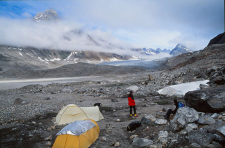 Retour au camp à 17h30 pour le rituel du thé et presque dans la foulée le repas du soir : soupe aux 4 fromages, purée à l’oseille, mimolette, oignon et deux cafés. Belle soirée où l’on tire des plans sur le trajet du soleil vers l’ouest et le glacier nous regarde d’un air narquois. 20h30 : tout le monde sous la tente.