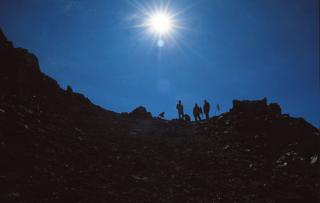 De déchirures en déchirures, une brèche apparaît qui nous tend les bras. Longue grimpette vers le soleil. Le ciel se dégage de plus en plus et la brèche se fait désirer : la montée est vraiment longue. Là-haut, entre deux tours blondes et noires, on se fait une petite pause bouffe sur un promontoire aérien qui domine une vallée grondante de son torrent boueux.
