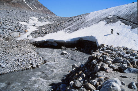 Faut dire que le sommet de la veille : le « 1200m » n’a pas été de tout repos… Départ du camp à 9h50. Il a bien fallu remonter jusqu’au glacier de la Brèche afin de pouvoir traverser le torrent.