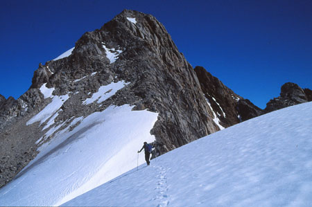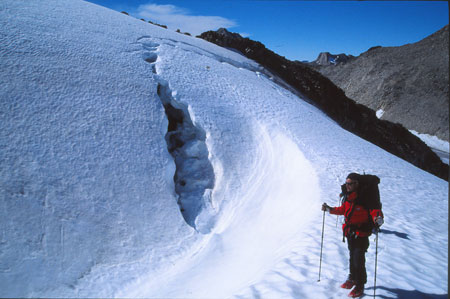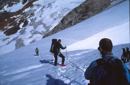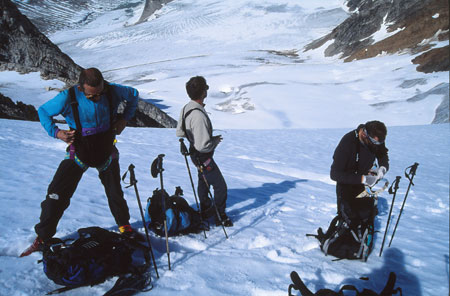 Puis longue remontée dans les fins éboulis du contrefort du « 1200 ». Arrivé à un col, on s’encorde pour le passage d’une rimaye.