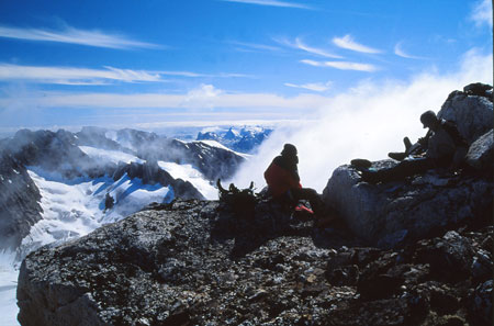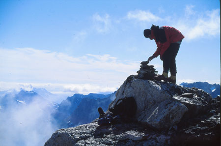 Passage d’une vire rocheuse et c’est le sommet tabulaire où il subsistait un reste de cairn… pour une fois, on n’est pas les premiers ! Didier le remonte mais on n’a rien sur nous pour laisser à l’intérieur.