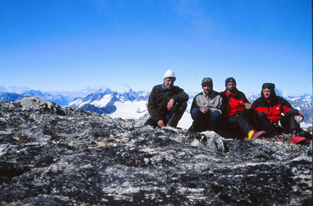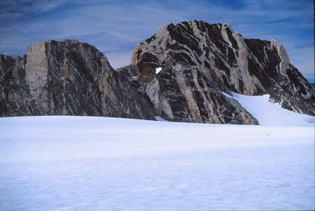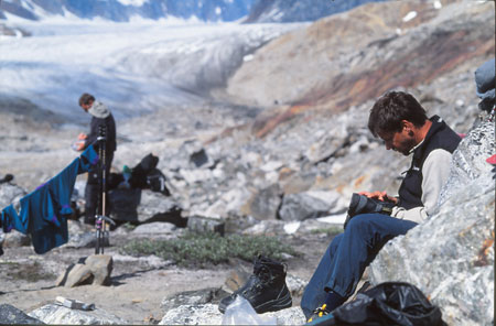 Descente vers le col « 710m » : vaste plateau neigeux étincelant sous le ciel bleu. Retour au camp en passant au pied de la face ouest du « 1200 ». Belle ballade glacière avec reconnaissance de beaux petits coins où planter la tente demain. Traversée du torrent avec de l’eau jusqu’aux genoux et arrivée au camp 5 minutes avant Bernard et Didier. Thé, pain d’épices et ½ cigare… plus de clops depuis hier ! Alors là, j'ai franchement merdé dans l'estimation de ma consommation !