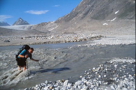 Retour au camp vers 19h. Longue course de 9h. Le thé sera suivi du repas et je file dans la tente finir les "Piliers de la Terre"... merci Béa ! Aujourd’hui mercredi, les moustiques sont au rendez-vous. La brise fraîche est bonne et le grondement perpétuel du torrent est devenu familier à nos oreilles. Il coule au milieu d’une multitude d’écheveaux s’étalant dans cette vallée à fond plat et sableux. Le « 1200 » surveille tout ça… Une langue glaciaire sort de l’amont et vient buter contre des rocs rouges et ocre. Quelques taches mauves d'épilobes parsèment les bords du torrent.