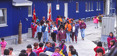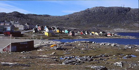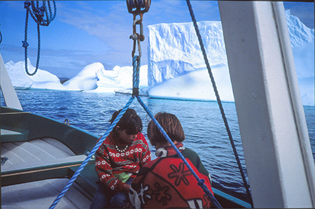 Lundi 29 juillet. Le petit déjeuner se termine sous le soleil, à côté de la tente plantée sur les hauteurs de Qaqortoq. Quatre jours passés en transit à voir passer des avions, des bateaux, des gens, des lieux, des icebergs, une aurore boréale, des nuages, de la pluie... Une escale rapide à Copenhague puis à Sondre dans un aéroport bondé et bruyant. Le survol de la côte ouest du Groenland se fait au-dessus des nuages. Juste une éclaircie en arrivant sur Narsarssuaq où on a le temps d'apercevoir, à travers les hublots, le sommet du 2200 de l'année dernière. Deux nuits au camping de Narsarssuaq puis le bateau jusque Qaqortoq. L'express côtier, le Tatérak, dessert tous les villages et l'ambiance y est au papotage... je me souviens de Karen Marie et sa mère, Bolette.