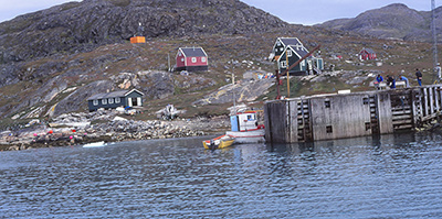 Ammassivik... On est les seuls à descendre du bateau ! Ouahou !! Où est-ce qu'on est ? ça c'est le Groenland comme je l'aime : un petit quai où quelques poissons trainent dans des casiers et sur les tables de découpe, quelques maisons isolées, quelques groenlandais désœuvrés venus regarder arriver le bateau hebdomadaire, quelques chiens et la grande lumière au-dessus de tout ça !!