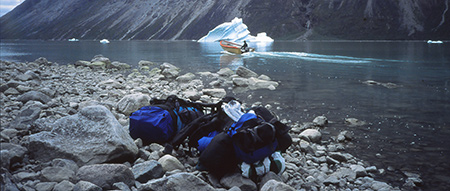 Rapidement, on trouve un pêcheur prêt à nous emmener au fond du fjord de Sioralik, là où les icebergs viennent mourir. Il nous débarque, nous et nos gros sacs et repart en nous faisant un dernier signe... sans rien nous avoir demandé de notre destination alors qu'on est au bout du monde, comme s'il n'y avait rien de plus normal que de nous laisser là alors qu'il n'y a plus rien devant nous... On est entièrement livré à nous même pour 23 jours !