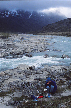 La vue sur l'amont de l'Isortoq nous est cachée. On ne voit qu'une immense cascade qui tombe d'un glacier suspendu. 20h. Le vent a tourné. Il vient de l'ouest mais il est toujours bien froid (7° dehors). On vient de faire un feu avec nos premières poubelles. On rentre sous la tente. L'Isortoq gronde toujours mais cela devient presque amical comme un fond sonore auquel on s'est habitué.