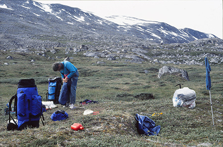 Samedi 3 aout. 17h30. Camp 3. Assis, dos calé contre un rocher, l'Isortoq à 5m devant moi, quelques moustiques, le soleil aussi mais un vent froid qui vient du sud... on vient de se boire un thé et une tranche de pain d'épice aux fruits confits, Bernard trafique l'altimètre... on est bien ! Longue journée... Redescente à vide au camp 2 pour vider la cache de vivres. Pendant la descente, on a pu entendre le bruit d'un moteur (avion ou hélico). C'est bizarre que je mentionne ici un bruit de moteur... ce n'est pas dans les Alpes ou ailleurs en Europe que ce bruit prendrait autant d'importance.