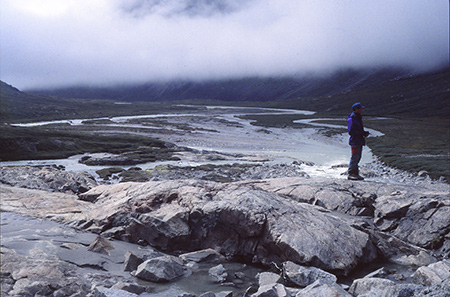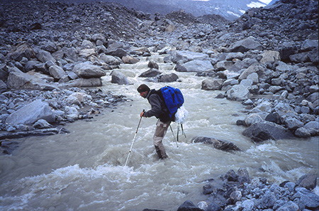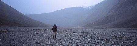 Mardi 6 aout. 20h45. 7° à l'extérieur. Altitude 700m. Départ vers 10h30 pour redescendre au camp 3 chercher le reste des vivres. Le plafond est bas mais ça a l'air de tenir le coup, alors on se lance. RAS jusqu'au camp 3. Retour sous le crachin. On est talonné par de gros machins gris qui remontent du bas de la vallée. La traversée de deux torrents qui descendent des glaciers fut un peu délicate. Je choisis la méthode dans l'eau jusqu'aux genoux. Mais ça vous file un bon coup de froid ! Repas au feu de bois sous un jeu de lumière et de nuages. Au loin, vers l'amont, la calotte glacière nous est apparue, un moment, baignée de lumière et de soleil. C'est tout pour ce soir... mes chaussures sont bien trempées.