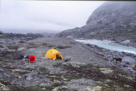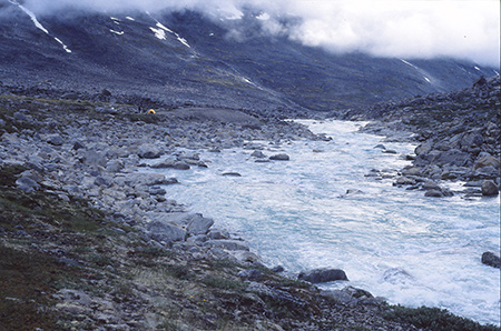 Dimanche 4 aout. 21h. Camp 4 établi à 650m. 13° sous la tente. Il pleut depuis 16h. Encore un camp dont on n'a pas encore vu grand chose. Le matin s'annonçait pourtant beau avec un vent d'ouest qui amenait des nuages d'altitude. Retour des mouches et moustiques. Remontée de l'Isortoq en rive gauche. Elle s'étale de plus en plus grassement dans des plaines de plus en plus vastes. On a aperçu quelques mouflons, toujours sur l'autre rive. Petite pause sous un rocher, traversée de la moraine et de deux torrents. La pluie nous a chopé alors qu'on cherchait un abri sous roche pour installer le camp. Montage de la tente sous une averse qu'on a vu arriver de loin. Sous les nuages, les glaciers environnants ont l'air de dégager leur propre lumière.