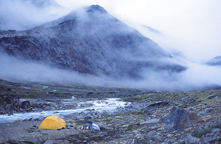 20h30. 9° sous la tente. Le repas du soir vient de se terminer dehors avec le spectacle de langues de brouillard qui s'étirent, s'écharpent et enlacent la vallée de l'Isortoq. Un nouveau gros nuage montre le bout de son nez au détour de la vallée, vers l'aval. A peine sortis de la tente, on l'entend clapoter sur la toile. Repli stratégique... Bernard avec Boro, moi avec la tendre sultane des mille et une nuits. Dieu, qu'on est loin de tout !